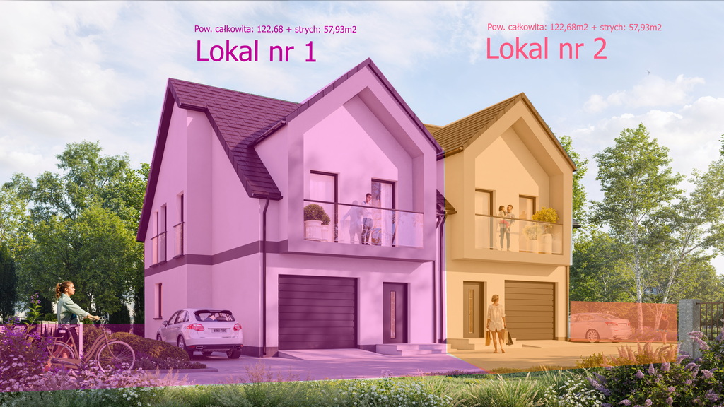 - Każdy dom składa się z: parteru + piętra (o pow. całkowitej 122,68m2) + strychu o pow. całkowitej 57,93m2 = 180,61m2