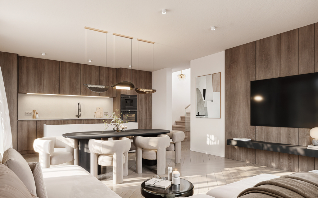 - Liczba sypialni: 3 oddzielne sypialnie na piętrze (+ strych do ewentualnej własnej aranżacji) + salon z aneksem kuchennym na parterze